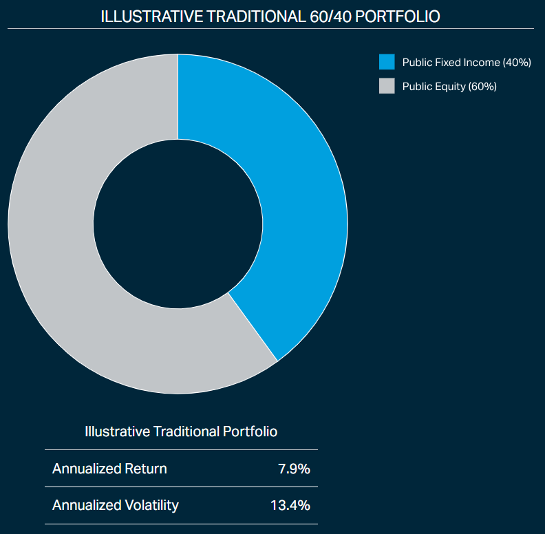 Source: Bloomberg, Cambridge Associates, NCREIF, as of December 2023, latest available. The 60/40 portfolio is 60% allocated to the S&P 500 Index and 40% allocated to the Bloomberg US Aggregate Bond Index. Private Credit is represented by the Cliffwater Direct Lending Index. Private Real Estate is represented by the NFI- ODCE Index. Private Equity is represented by the Cambridge Associates US Private Equity Index. Annualized returns and annualized volatility are calculated based on quarterly returns over the 5-year period from July 2018 to June 2023. Past performance is no guarantee of future results. The information herein is provided for educational purposes only. The benchmarks, indices and portfolio concentration provided herein were selected by Fortress for illustrative purposes only. Selection of such benchmarks, indices and/or portfolio concentration is inherently subjective and others might select other benchmarks, indices or portfolios based on their assessment of the market. These returns do not reflect the portfolio of any specific investor, and there can be no assurances that any investor will receive the returns shown herein. Actual returns may be materially different.